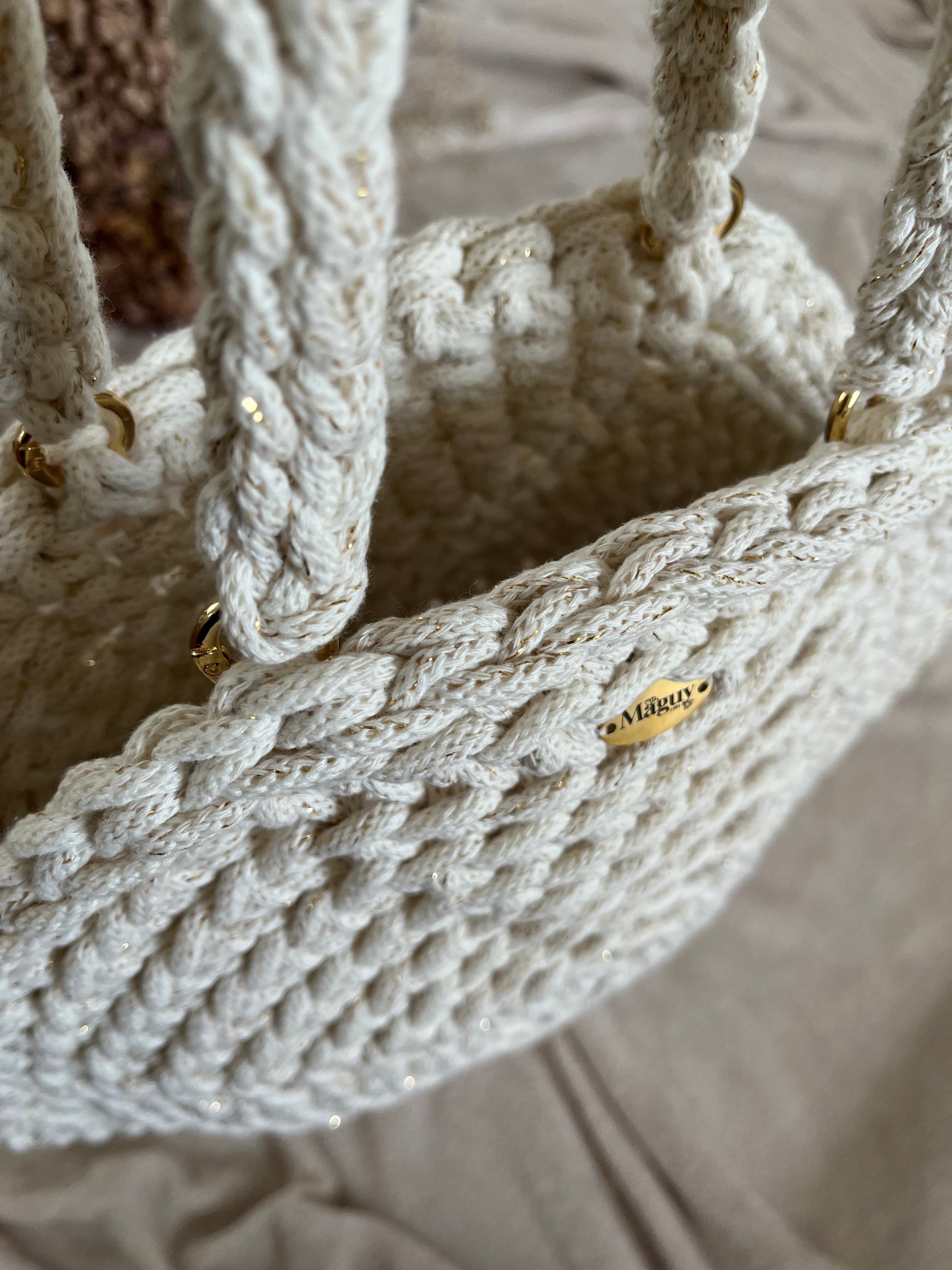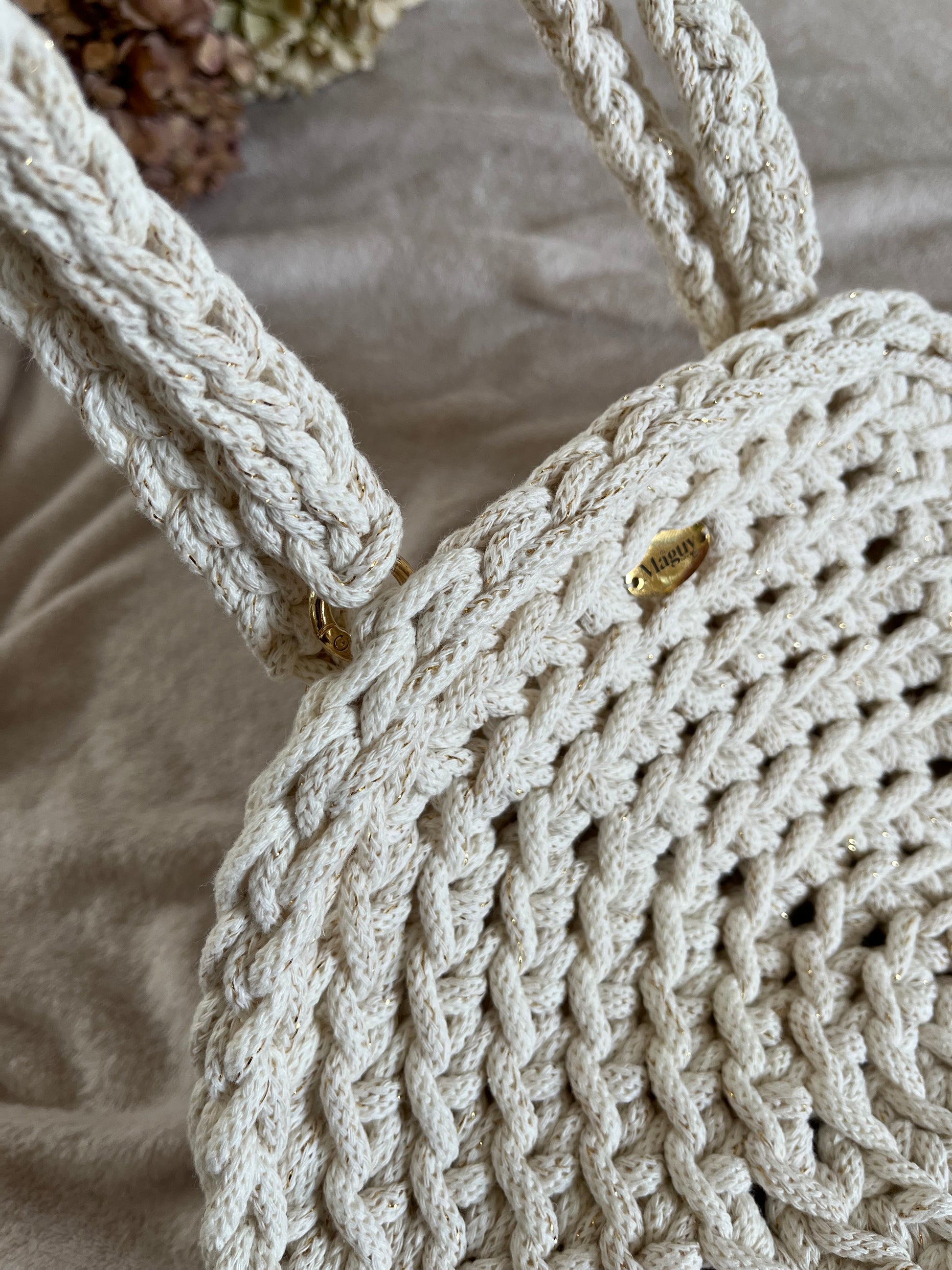 Son petit plus ? De fins liserés dorés discrètement tissés dans la corde, qui lui apportent une touche subtile de brillance et d’originalité – pour un rendu à la fois sobre, raffiné et lumineux.