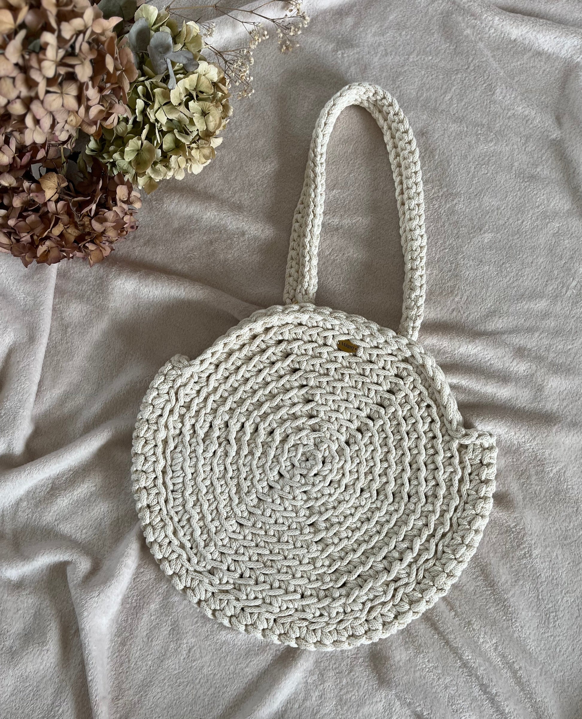 Ce sac rond au style panier est entièrement réalisé à la main avec une corde 100 % coton recyclé et certifié OEKO-TEX. Une matière douce, résistante, et respectueuse de l’environnement 🌱