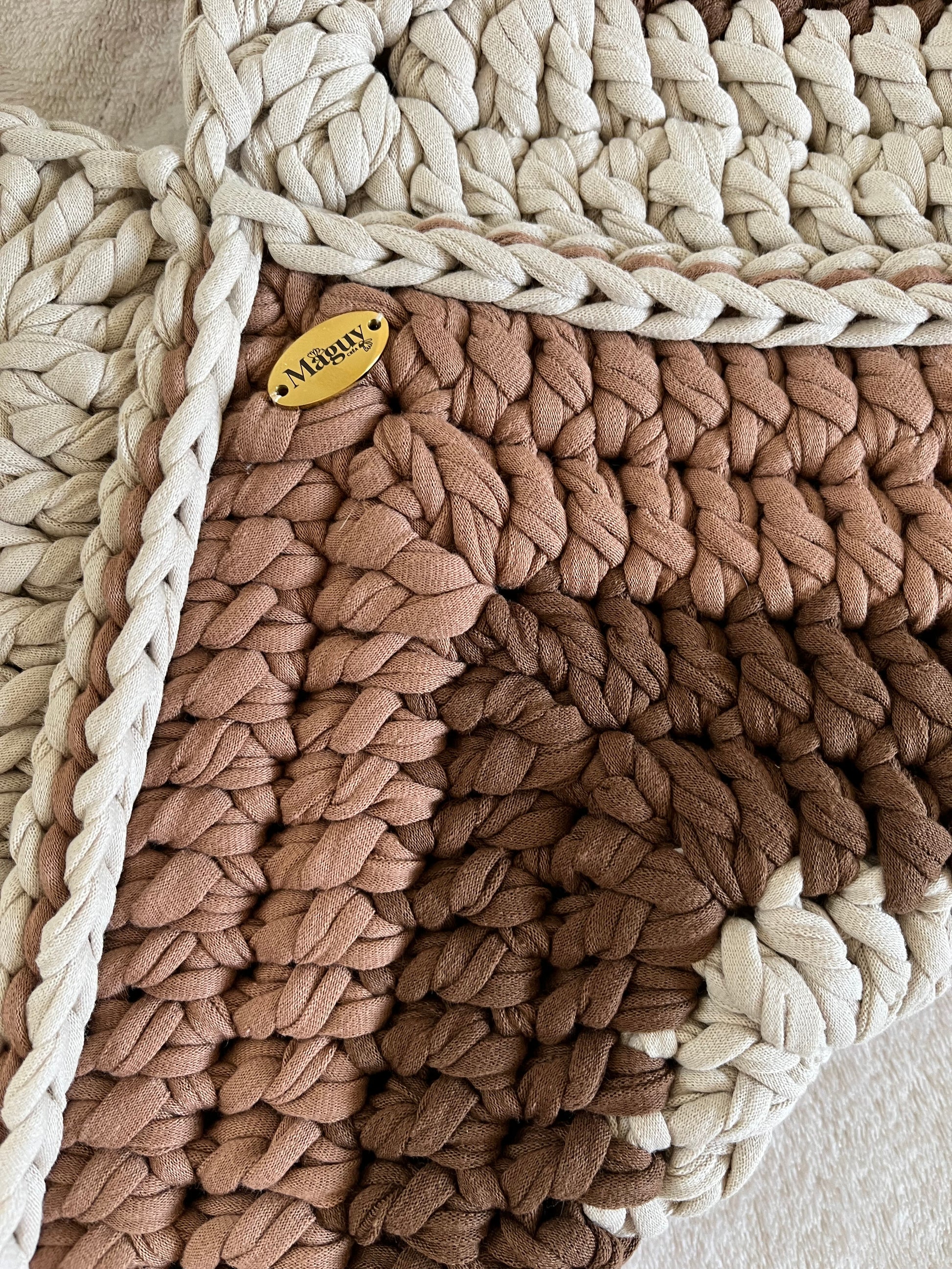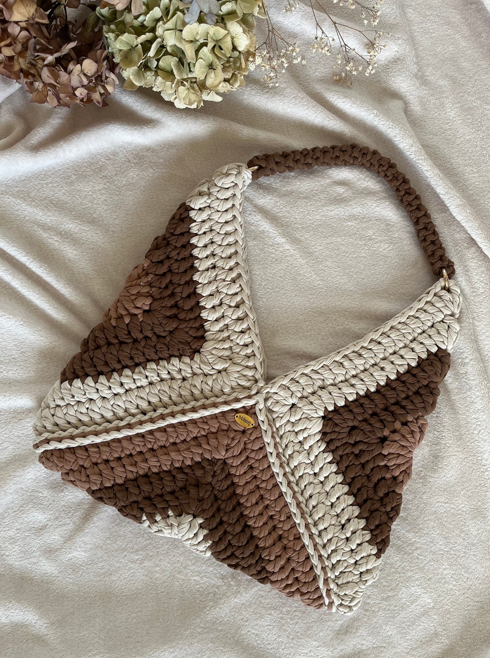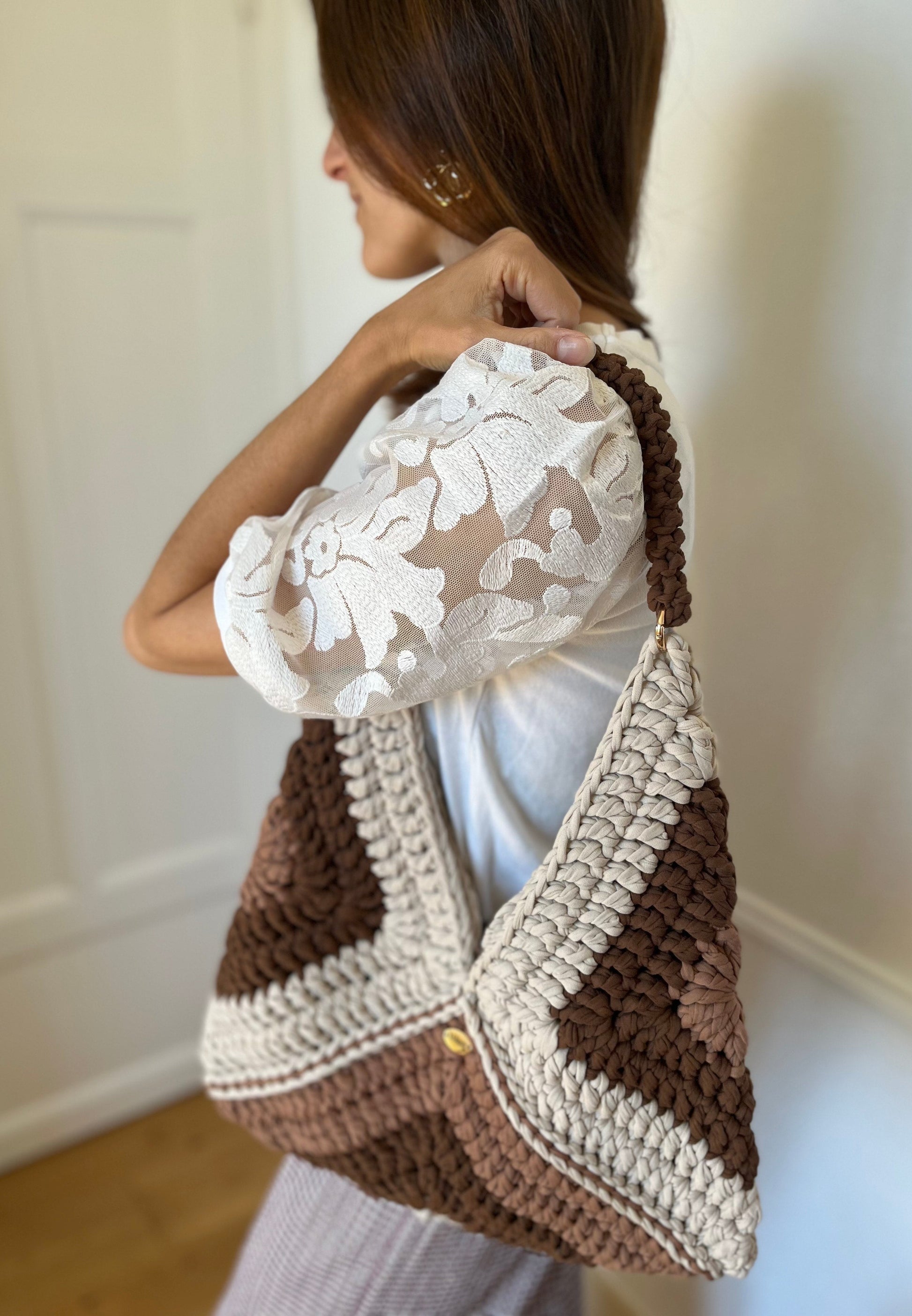 Ce sac carré granny en version tricolore marron est entièrement crocheté à la main, avec un fil T-shirt certifié GRS et OEKO-TEX. Une matière souple et légère, parfaite pour les beaux jours, douce pour vous et pour la planète 🌍