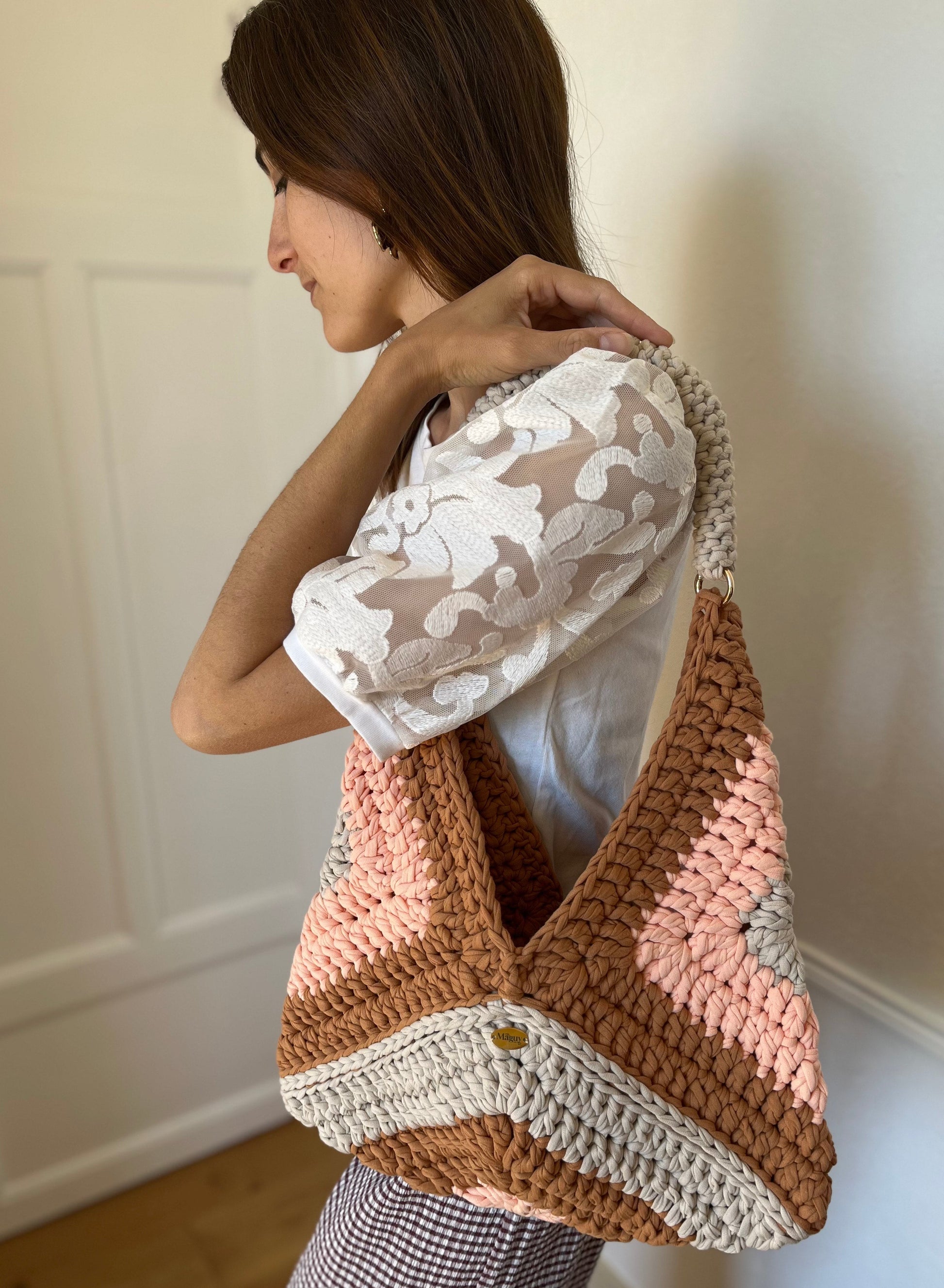 Ce sac carré granny en version tricolore est entièrement crocheté à la main, avec un fil T-shirt certifié GRS et OEKO-TEX. Une matière souple et légère, parfaite pour les beaux jours, douce pour vous et pour la planète 🌍