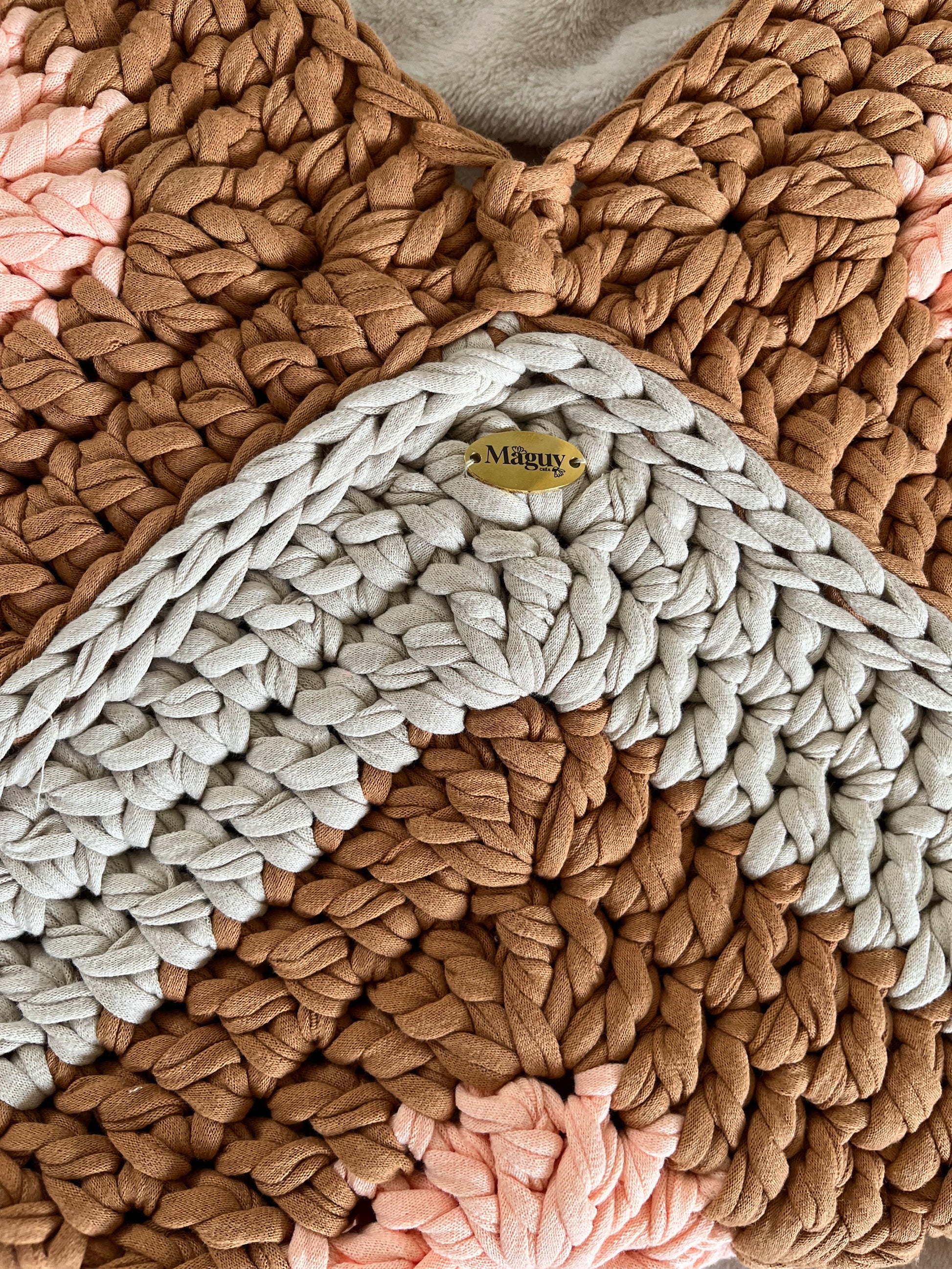 Les tons naturels de beige et camel sont relevés par une subtile touche de pêche, pour un rendu à la fois doux et lumineux. Une pièce originale, pleine de charme, à emporter partout avec vous – du marché du week-end à la terrasse d’été.